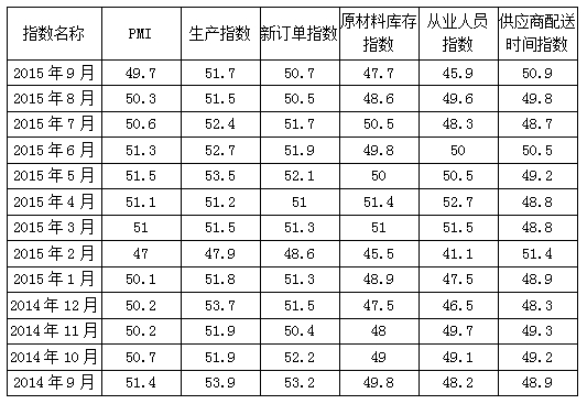 表1 2014年9月-2015年9月日本a片 重点企业PMI主要分项指数值表