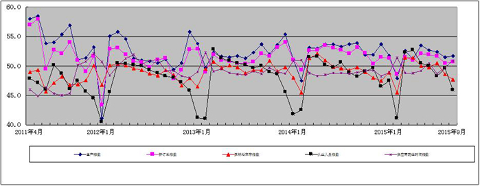 2015年9月,日本a片 制造业采购经理指数(重点企业PMI)为49.7,较上月回落0.6个百分点(见图1);5项权重指数中,生产量指数、新订单指数、配送时间指数回升,其余两项回落(见图2)。