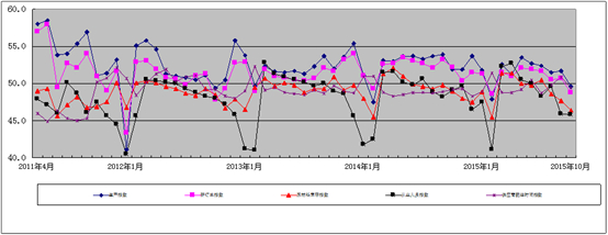 图2 2011年4月-2015年10月日本a片 重点企业PMI分项指数趋势图