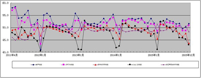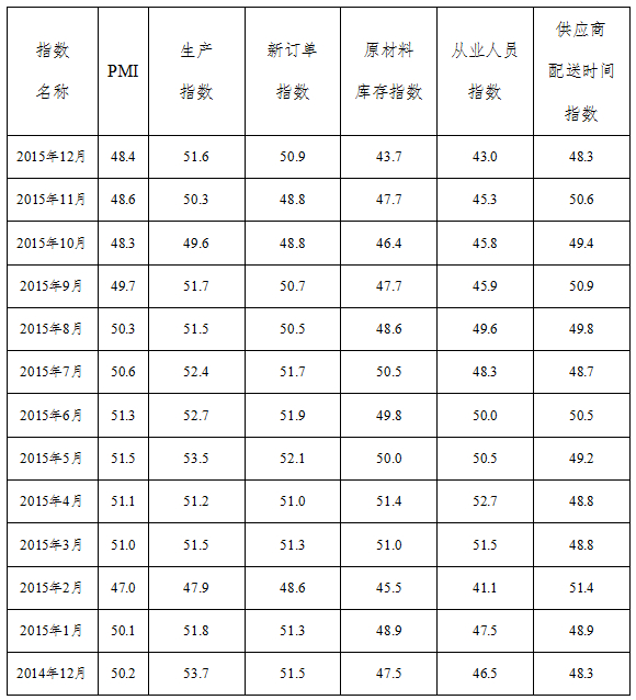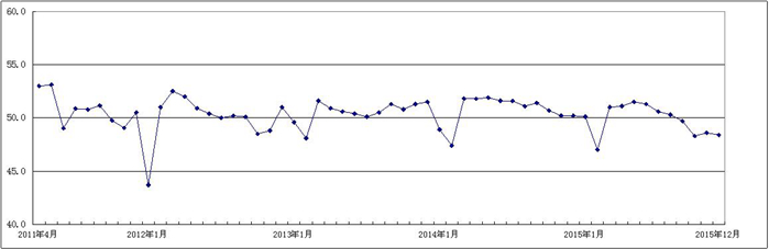 2015年12月,日本a片 制造业采购经理指数(重点企业PMI)为48.4,较上月回落0.2个百分点(见图1);5项权重指数中,生产量指数、新订单指数回升,原材料库存指数、生产经营人员指数和供应商配送时间指数回落(见图2)。