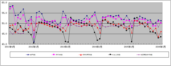 图2 2011年4月-2016年1月日本a片 重点企业PMI分项指数趋势图
