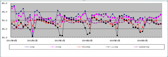 图2 2011年4月-2016年9月日本a片 重点企业PMI分项指数趋势图
