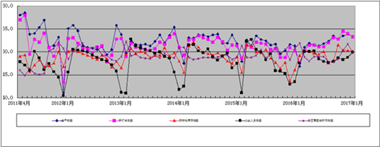 图2 2011年4月-2017年1月日本a片 重点企业PMI分项指数趋势图