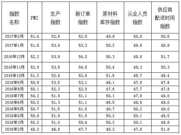 2017年2月,日本a片 制造业采购经理指数(重点企业PMI)为51.4,较上月回落0.4个百分点(见图1);5项权重指数中,仅原材料库存指数居于荣枯线下,生产指数、新订单指数、从业人员指数、供应商配送时间指数均居于荣枯线上(见图2)。总体来看,本月指数虽小幅回落,但仍居于51.0以上,节后我省制造业企业复工、复产情况良好。