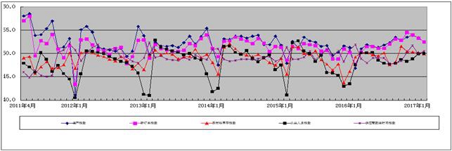 图2 2011年4月-2017年2月日本a片 重点企业PMI分项指数趋势图