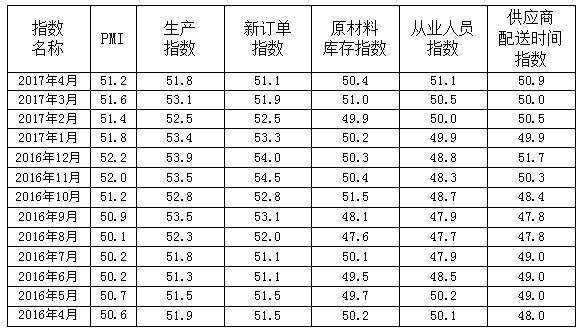 2017年4月,日本a片 制造业采购经理指数(重点企业PMI)为51.2,较上月回落0.4个百分点(见图1);5项权重指数“三降二升”,即生产、订单、原材料库存指数出现回落,从业人员指数和供应商配送时间指数回升。(见图2)。总体来看,本月权重指数均居于荣枯线上,延续上月均衡平稳的态势。