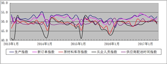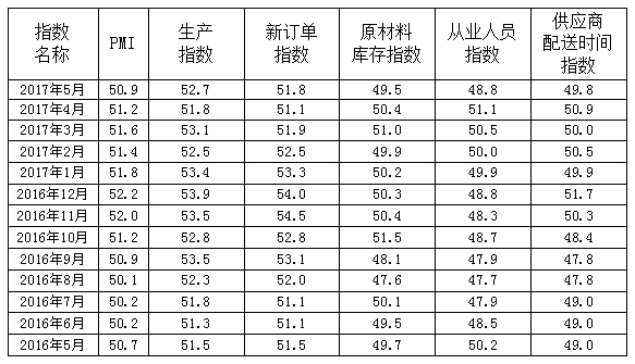 2017年5月,日本a片 制造业采购经理指数(重点企业PMI)为50.9,较上月回落0.3个百分点(见图1);5项权重指数中,生产、新订单指数回升,库存、雇员和配送时间指数均回落至荣枯线下(见图2)。总体来看,制造业PMI指数继续保持在扩张区间,工业经济总体平稳增长;但权重指数中有三个指数重回荣枯线下,说明当前工业运行的不确定性增加。