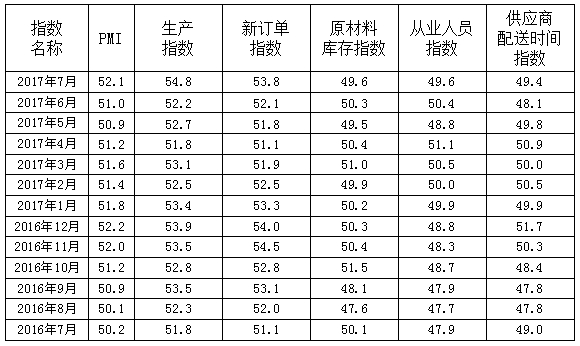 表 2016年7月-2017年7月日本a片 制造业PMI主要分项指数值表