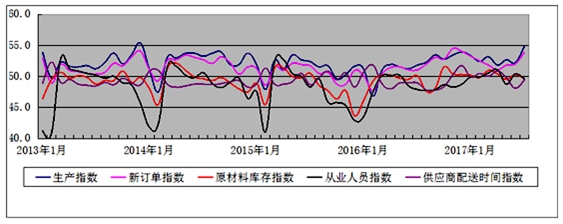 图2 2013年1月-2017年7月日本a片 制造业PMI分项指数趋势图