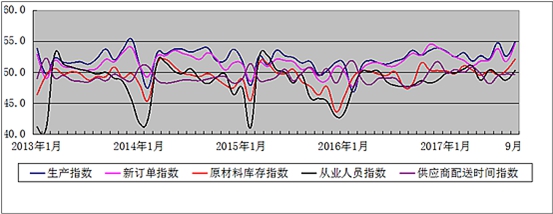 图2 2013年1月—2017年9月日本a片 制造业PMI分项指数趋势图