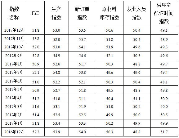 表 2016年12月—2017年12月日本a片 制造业PMI主要分项指数值表