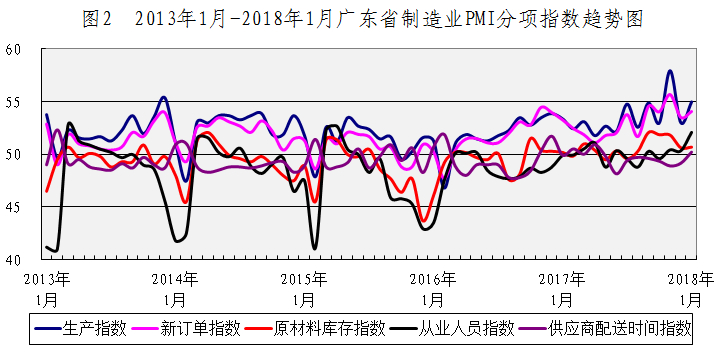 省PMI指数特约解读专家、省委党校教授陈鸿宇认为, 2018年1月我省PMI指数为53.0,已经连续第23个月居于荣枯线上。直接决定PMI指数的五项权重指数中,生产指数和新订单指数分别为55.0和54.1,继续保持产销高位协调态势。体现制造业内外需状况的新订单、新出口订单、积压订单和进口订单指数,全部居于荣枯线上。值得注意的是,本月从业人员指数已经爬升至52.1,这是自2015年4月至今32个月来的最高位。上述状况表明,我省制造业稳中有进、稳中求好的态势更加稳固,企业的市场预期较为乐观,生产活动和采购活动比较活跃,所创造的就业岗位也在不断增加。