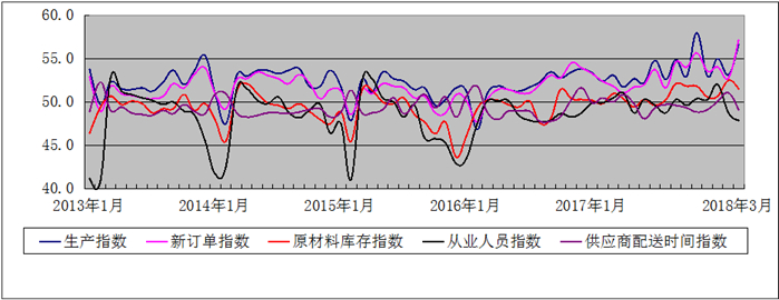 图2 2013年1月—2018年3月日本a片 制造业PMI分项指数趋势图