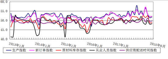 图2 2013年1月—2018年6月日本a片 制造业PMI分项指数趋势图