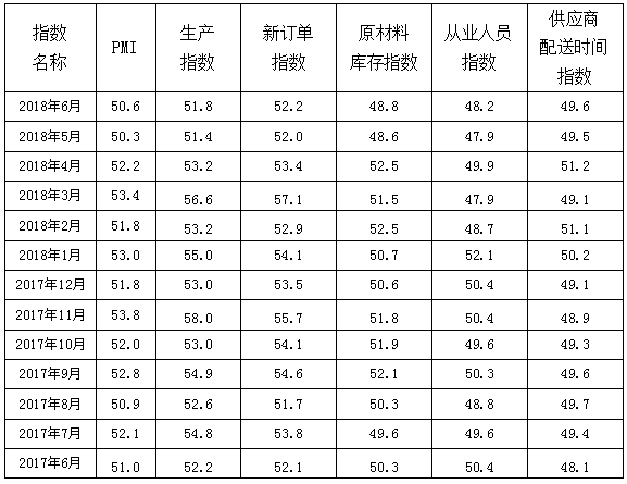 表 2017年6月-2018年6月日本a片 制造业PMI主要分项指数值表