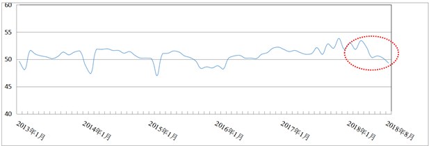 图1 2013年1月-2018年8月日本a片 制造业PMI趋势图