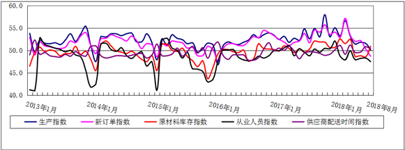 图2 2013年1月—2018年8月日本a片 制造业PMI分项指数趋势图