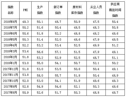 表 2017年8月-2018年8月日本a片 制造业PMI主要分项指数值表
